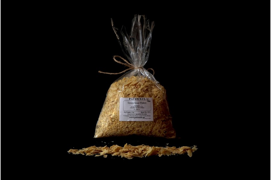 Οι νιφάδες πράσινου σαπουνιού όπως και το πράσινο σαπούνι ελιάς, παράγονται από πυρηνέλαιο (το λάδι που εξάγεται από τον πυρήνα και την φλούδα της ελιάς). Αφού τις διαλύσετε στην κατάλληλη ποσότητα νερού δημιουργείτε ένα υγρό καθαριστικό εύχρηστο για τον οικιακό καθαρισμό, ιδιαίτερα ασφαλές για παιδιά και κατοικίδια.